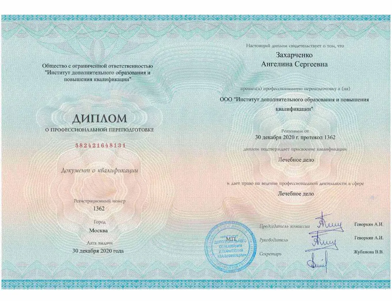 • 2020 - Институт дополнительного образования и повышения квалификации ( Диплом о профессиональной переподготовке по направлению "Лечебное дело")